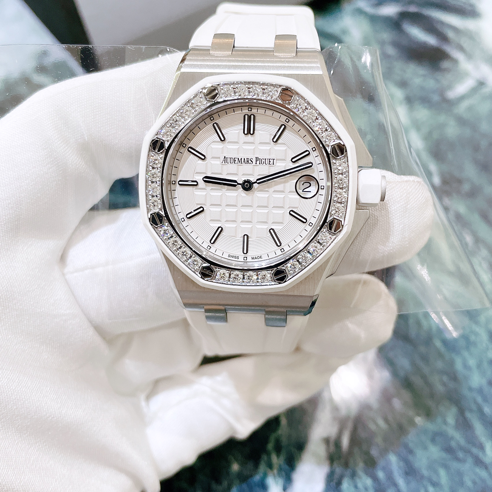 | AP Ladies Royal Oak Offshore Ref.67540SK White Dial Diamond Bezel 37mm [Under Servicing Warranty til Feb 2028] | |